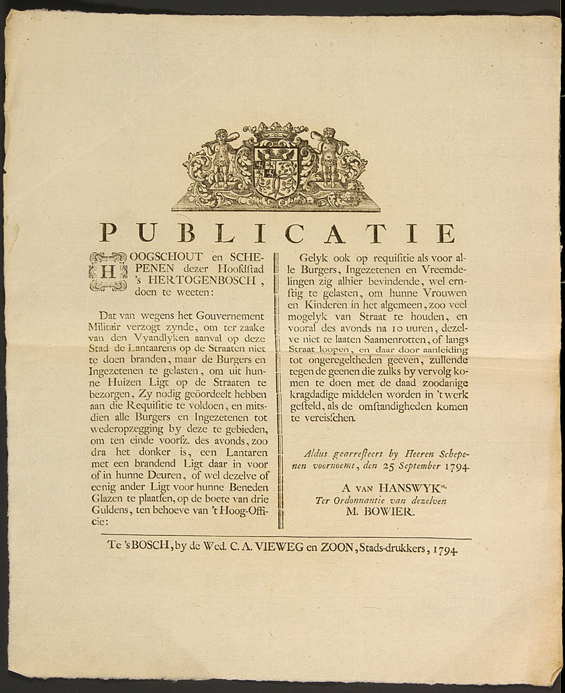 - BeschrijvingPublikatie van de schepenen van 's-Hertogenbosch met aanwijzingen voor de burgerij betreffende het beleg.
