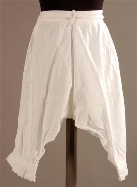 - BeschrijvingWitte katoenen onderbroek met zijsplitten. Katoen in platbinding. Splitten te sluiten met witte katoenen bandjes (genaaid met zigzagsteek). Pijpen 5.5 cm boven de onderkant gerimpeld. Rimpels vastgezet door opgestikte strook witte katoen. Strook versierd met 3 opnaadjes. Langs de zoom van de pijp is een smal broderiekantje genaaid.