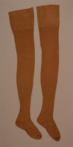 - Beschrijving1 paar donkerbeige viscoserayon cottonkousen (echte naad en mindering, lip in teenstuk). Boven aan de boord een ingebreid picotrandje. Hiel en teenstuk later verkleind door ingenaaide plooien.