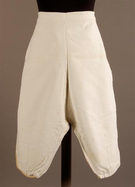 - BeschrijvingOnderbroek van witte keperkatoen. Splitten in beide zijden, te sluiten met witte keperbandjes. Ingezet kruis (vier spietjes). Jukstuk in achterpand. Door de zoompjes van de pijpen zijn elastiekjes geregen