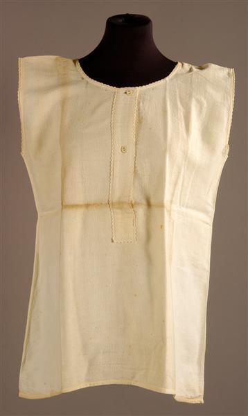 - BeschrijvingCreme flanellen hemd. Ronde hals en armsgaten. Split met beleg middenvoor. Langs hals, armsgaten en beleg een geschulpt bandje. Het beleg wordt gesloten met 2 katoenen knoopjes en 2 knoopsgaten. Zijnaden gerend gesneden