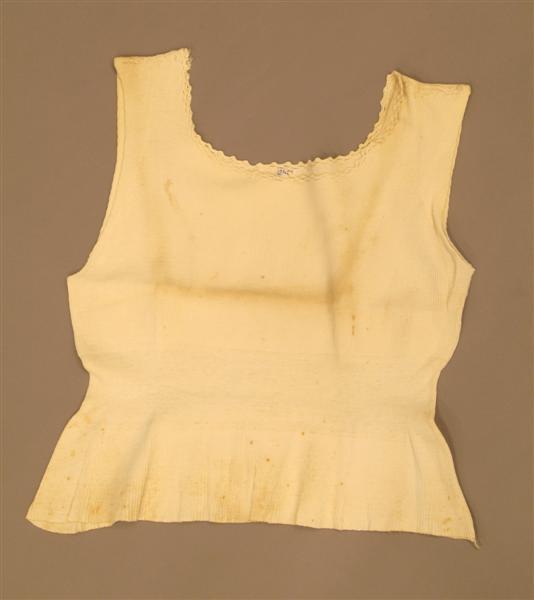 Lijfje van witte katoenen tricot. Bijna geheel 1r1av ribtricot. Wijde ronde halsuitsnijding. Geen mouwtjes in de huidige toestand. Waaschijnlijk waren ze vroeger wel aanwezig en zijn ze later afgeknipt. De daarna te brede schouders zijn versmald door de schuine gedeelten van het tricot naar binnen te slaan en vast te naaien. Iets boven de taille is het lijfje versmald door gebruik te maken van dunner garen over een hoogte van ca 7 cm. Deze rand wordt langs boven- en onderkant begrensd door smalle 'visgraat' randjes. Langs de hals is een open randje met picotjes gehaakt in witte katoen