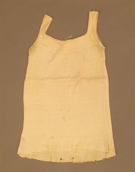 - BeschrijvingKatoenen tricot borstrok, gebroken wit, zonder mouwtjes. Geheel gebreid in 2r2av ribtricot. Ronde hals en armsgaten afgezet met een open randje. Door dat van de hals is een kunstzijden veterbandje geschoven