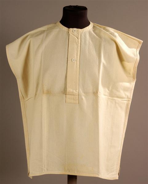 Creme baaien (wollen) borstrok zonder mouwen. Het stuk is gemaakt uit een dubbelgevouwen baan baai. De zelfkanten (rose en blauw) zijn omgeslagen en met flanelsteken vastgezet. Tussen armsgaten in zijn splitjes en zijn voor- en achterpand aan elkaar genaaid. Onder de armsgaten en boven de splitjes zijn verstevigingen met festonsteekjes aangebracht. Ronde halsopening, afgewerkt met een wit bandje. Split met beleg. Sluiting met 2 katoenen knoopjes en knoopsgaten