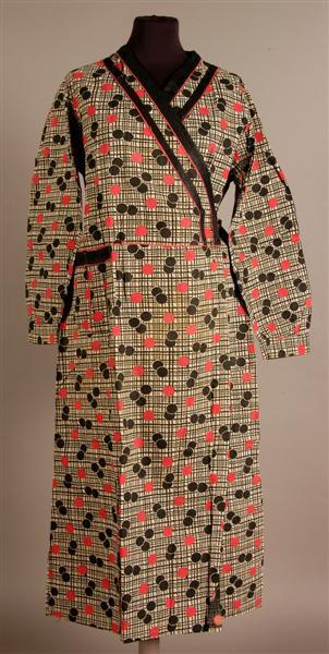 Mouwschort met overslag in bont bedrukte katoen. Katoen: wit, bedrukt met zwarte ruiten en met rode en zwarte noppen. De overslag is boven de taille afgezet met zwarte randen en rode biesjes. De taillenaad (alleen in de voorpanden) is versierd met een rood biesje. Op het rechtervoorpand een zak, afgezet met zwart band en rode biesjes. De schort wordt gesloten met 2 banden, op taillehoogte aan de voorpanden gezet. De band aan het linkervoorpand wordt door een knoopsgat boven de zak op het rechtervoorpand geschoven. Beide banden worden daarna op de rug gestrikt. Lange mouwen met manchetten.