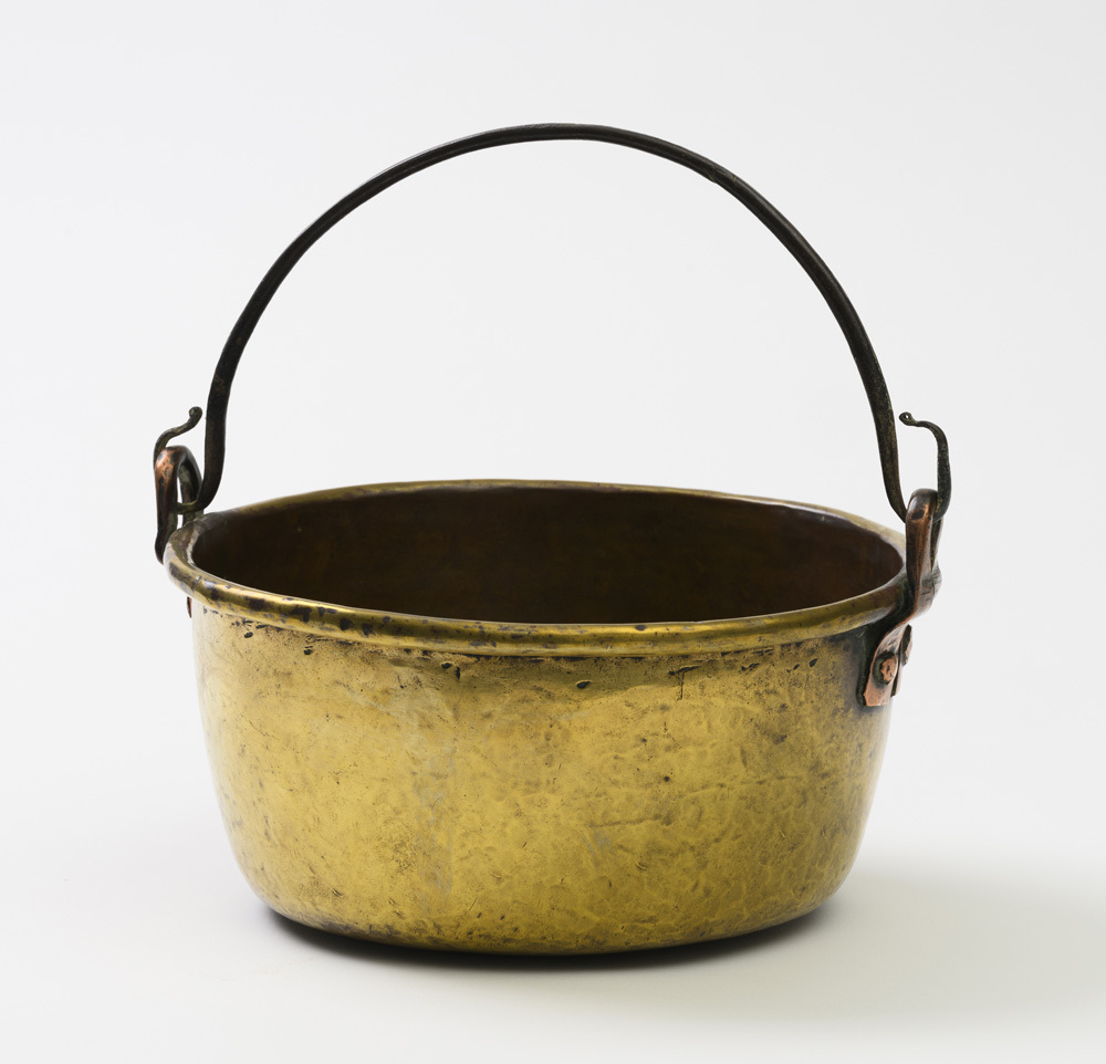 - BeschrijvingGeelkoperen ketel, platte bodem, iets schuine wanden met omgekrulde rand. Langs rand twee roodkoperen oren waaraan een ijzeren hengsel.