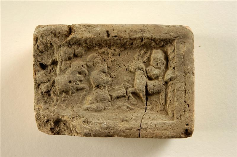 - BeschrijvingHaardsteen met afbeelding van knielende St. Hubertus, naar rechts voor kruisdragend hert. Halfbrede rand met meandermotief.