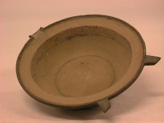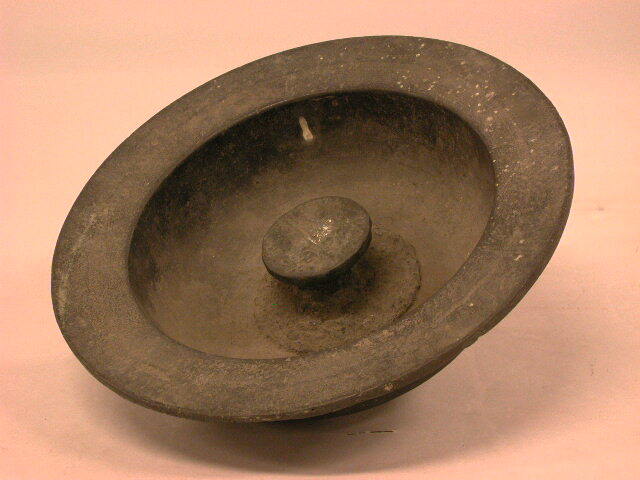 - BeschrijvingVoor diepe tinnen schotel met horizontale rand, bestaande uit twee delen: a. Schotelvormige mal met twee horizontale uitsteeksels (voor het vastzetten van de mal?), klein opstaand randje en platte tuitvormige overloop b. In de andere mal passende schotelvormige mal met centrale stempelvormige knop