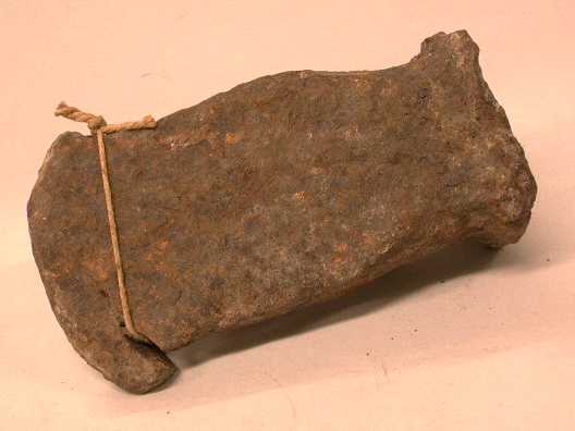 Blok ijzer met vanuit vierkant hamervlak naar convexe splijtrand taps toelopende zijden.