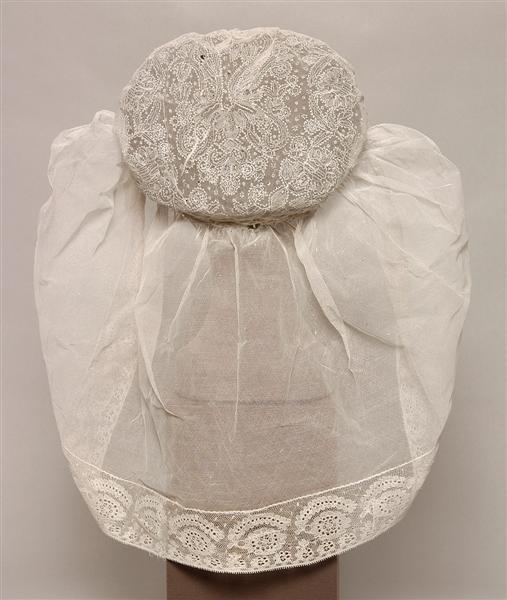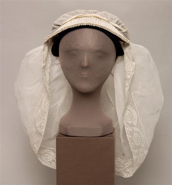 Geplooide voorstrook bestaande uit 3 lagen: kant op gaas op tule. Verstevigd met 2 dikke laitondraden. Meegeplooid is een dunne laitondraad die aan weerszijden van de voorstrook uitsteekt. De uitstekende stukken zijn op een lapje tule op de kant van de achterstrook genaaid. Schildje, 1.5 cm breed, van tule op gaas. Tulen bodem versierd met doorstopwerk in eenbloemig motief. Geklost laddertje met 2 doorgeschoven veterbandjes. Een bandje is "2 op 2 af" en het andere "2 af 2 op" geregen. Tulen achterstrook afgezet met machinale "maaskantse" kant.