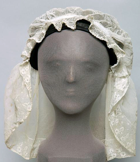 Voorstrook van tule waaraan een strook machinale kant genaaid is. De voorstrook is gerimpeld aan het schildje gezet. Mogelijk werd de voorstrook wel geplooid en dan met de handplooier. 1 cm breed schildje van tule op band. Bodem doorgestopte tule met eenbloemig motief. Geklost laddertje met 2 doorgeschoven veterbandjes. Korte achterstrook van tule waaraan een 4.5 cm brede kant genaaid is. De kant is waarschijnlijk machinaal geklost en van het type Point de Paris.