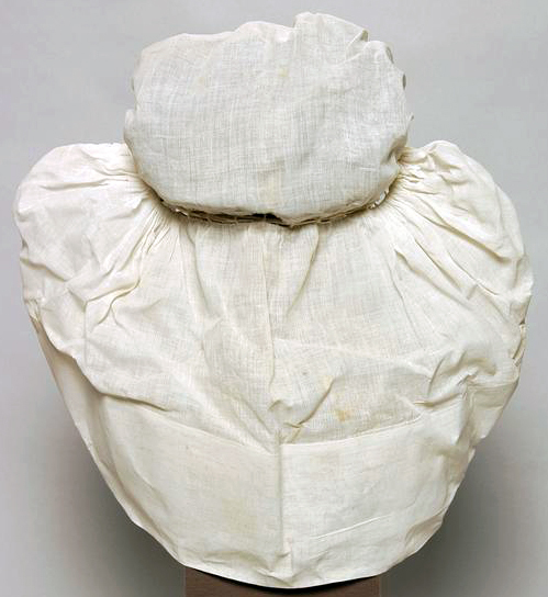 - BeschrijvingMuts van neteldoek, rouwdracht (en/of daagse dracht?). Geplooid voorstrookje, verstevigd met 2 draden dik laiton en een draad dun laiton (meegeplooid en aan beide zijden doorlopend op een klein strookje neteldoek op de achterstrook). Schildje 1.5 cm breed. Gehaakt laddertje met 2 doorgeschoven veterbandjes. Effen bodem en achterstrook. 12 cm brede zoom in de achterstrook. In 1986 ongenummerd aangetroffen.