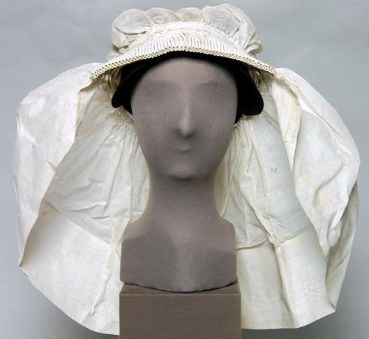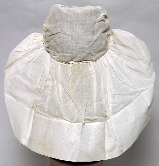 Muts van neteldoek, rouwdracht (en/of daagse dracht?). Geplooid voorstrookje, verstevigd met 2 draden dik laiton en een draad dun laiton (op een strookje tule meegeplooid en aan beide zijden over een lengte van 8 a 9 cm doorlopend op de achterstrook). Schildje bestaande uit een reep neteldoek en een reep gaas, beiden ca 1.5 cm breed, dakpansgewijs over elkaar genaaid. (Gazen strook mogelijk niet oorspronkelijk). Geklost laddertje met 2 doorgeschoven veterbandjes. Effen bodem en achterstrook. 11 cm brede zoom in de achterstrook.