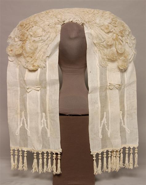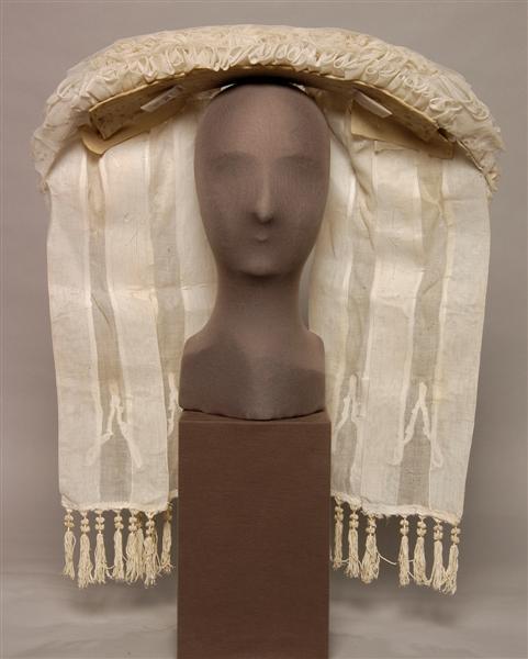 Poffer voor halve rouw. Romp van stijf gesteven gaas, versterkt met dik laiton. Brede, smalle oren. Op onderkant romp 2 lussen van batist. Langs voor- en achterkant, tussen de strikken, een geplooide en gerolde strook batist. Strikken van batist met brede zomen en versierd met randjes tweezijdig gerolde batist. Rayon franje. Op de romp een versiering met veertjes en stroken tule. Over het geheel een katoenen tule netje. Op de strikken een zigzagstrook met geponste gaatjes en een geschulpte onderrand. Tussen deze strook een tak met katoenen bloemen. Langs de buitenzijde van de strook een in lussen gelegde tweezijdig gerolde reep batist, langs de binnenzijde een tak veertjes.