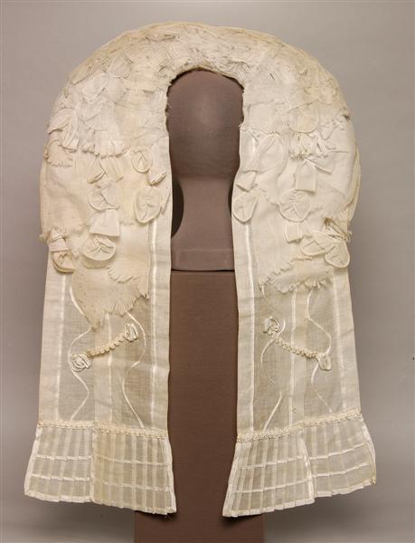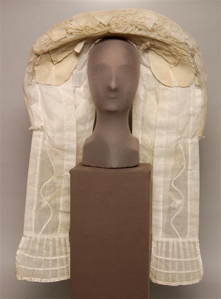 Lichtgebogen romp van stijf gesteven katoenen gaas. Verstevigd met dik laiton. Aan de onderzijde zijn 2 katoenen lapjes genaaid. Oren van hetzelfde gaas, ingeknipt aan de onderkant. Achter de oren een stukje karton (aan de binnenzijde beschreven). 13 cm brede strikken van fijne katoen, versierd met veterband van glanzende rayon en fantasiegalon. Aan de onderzijde van de strikken een geplooide strook katoen, versierd met hetzelfde band en galon als gebruikt voor de strikken. Over de strikken zigzag stroken, versierd met geponste gaatjes en aan de geschulpte onderzijde ingeknipt tot 'franje'. Op de romp een versiering van veertjes (ingeknipte katoen), bloemen en lussen met rolwerk. Langs de voorrand en de achterrand (tussen de strikken) een geplooide strook gerolde katoen. Op de strikken 3 afhangende takken met gerolde katoenen lussen en bloemen. Over versierde romp een strook grof katoenen gaas.
