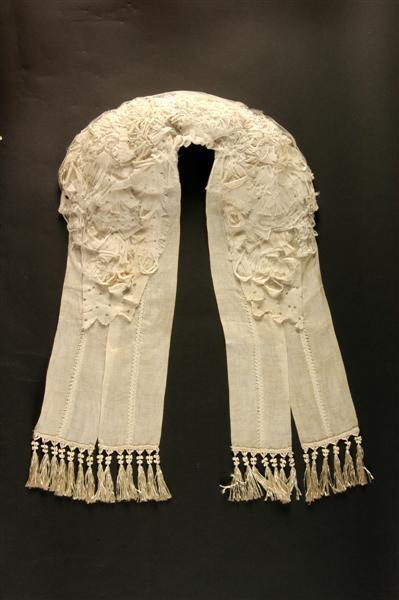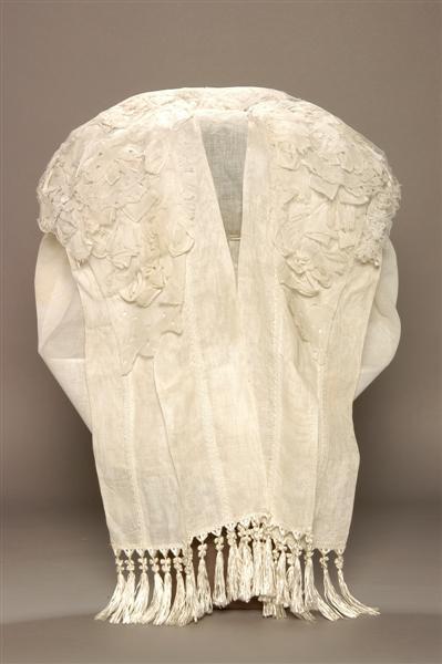Romp van stijf gesteven gaas, versterkt met dik laiton. Kleine oren van hetzelfde gaas. Onder de romp 2 katoenen lapjes. Langs de voorkant een strook batist in driedubbele stolpplooien opgenaaid. Langs de achterkant tussen de strikken een geplooide strook gerolde batist. Strikken van dubbele genaaide batist versierd met een rayon galon. Franje van rayon. Op de romp een versiering van veertjes en lussen en bloemen van gerolde batist. Zigzagstrook over de strikken van geponste batist met geschulpte rand. Tussen deze strook veertjes, bloemen en lussen van gerolde batist, langs de binnenkant een tak met geponste en geknipte blaadjes van batist. Over het geheel van bloemen en veertjes een tulen netje. In 1986 ongenummerd aangetroffen.