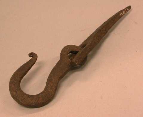IJzeren muurspijker (stevig model) met daaraan een haak (deze is diep, maar sluit niet geheel).