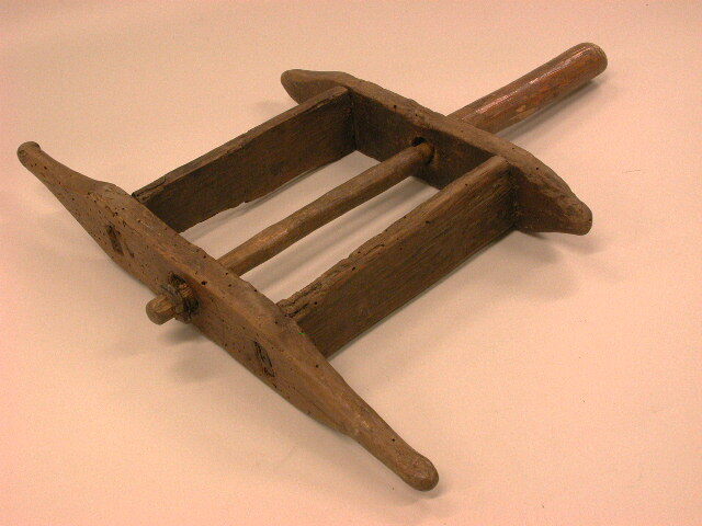 Houten raamwerk met naar de zijkanten uitstekende pootjes en handvat.
