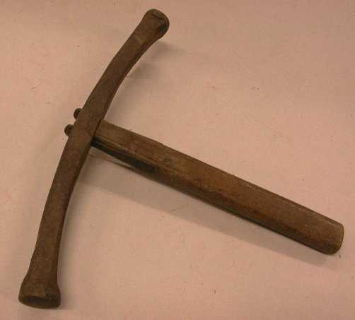 - BeschrijvingHamer van een koperslager met twee lange iets geslagen slagkanten in de vorm van een plat-ronde knop. De steel is aan de kop bevestigd d.m.v. strippen die van boven door het gat in de hamerkop naar beneden heengeslagen en vastgenageld zijn aan het hout.