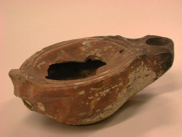 Romeins, laag plat aardewerk olielampje met reliëfversiering. De breedte van de tuit tussen de beide zijdelingse hoekpunten is aanmerkelijk smaller dan die tussen de voluuteinden aan de schouderrand. De volutentuit is driehoekig. Zwaar beschadigde spiegel met resten van een versiering, voorstelende een stier, die door een beer wordt aangevallen (vgl. Menzel afb. 27,19). De lamp is vervaardigd van witte klei en is roodbruin gevernist.
