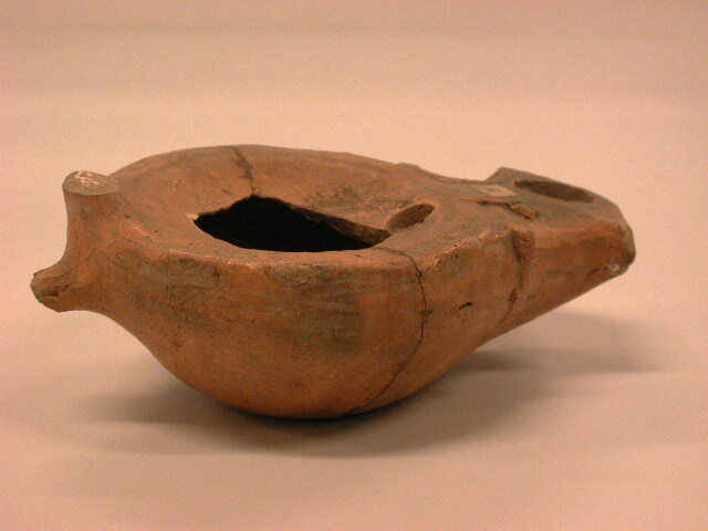 - BeschrijvingRomeins laag plat aardewerk olielampje. De breedte van de tuit tussen de beide zijdelingse hoekpunten is ongeveer gelijk aan die tussen de voluuteinden aan de schouderrand. De spiegel is zo zwaar beschadigd dat van de voorstelling geen sporen meer over zijn.