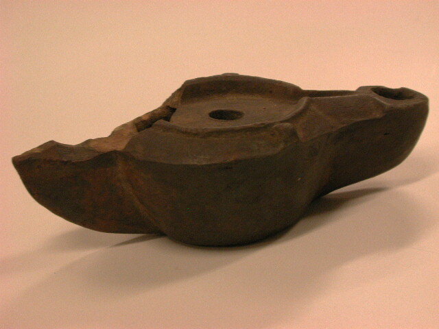 - BeschrijvingRomeinse aardewerk olielamp. Lage, platte vorm. Stempel EVCARPI(lees EUCARPI). Firmalamp met doorbroken schouderring zodat de gleuf op een tong lijkt. Van rode klei met groenachtig bruin vernis. Loeschcke p 276 e.v. en Menzel nr. 361 dateren Eucarpus in het laatste kwart van de 1e eeuw