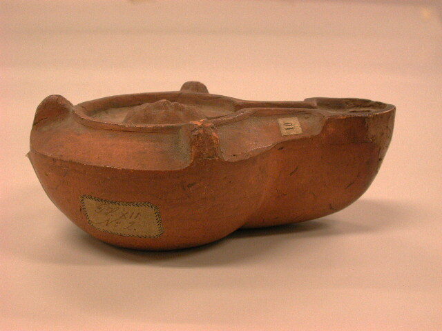 - BeschrijvingRomeins olielampje. Firma-lamp. Stempel FORTIS. Met doorbroken schouderring, zodat de gleuf op een tong lijkt.