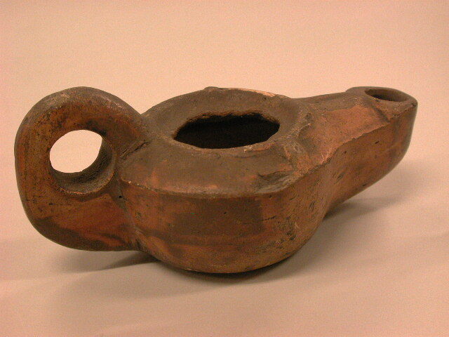 - BeschrijvingRomeins olielampje. Firmalamp zonder kanaal. Stempel onleesbaar. Gesloten schouderring en vlakke I-vormige gleuf op de hals van de tuit.