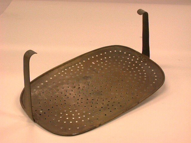 - BeschrijvingOvale geelkoperen plaat, aan bovenzijde vertind, geperforeerd in twee cirkels naast elkaar aan weerszijden (korte kanten) voorzien van staafvormige handvatten.