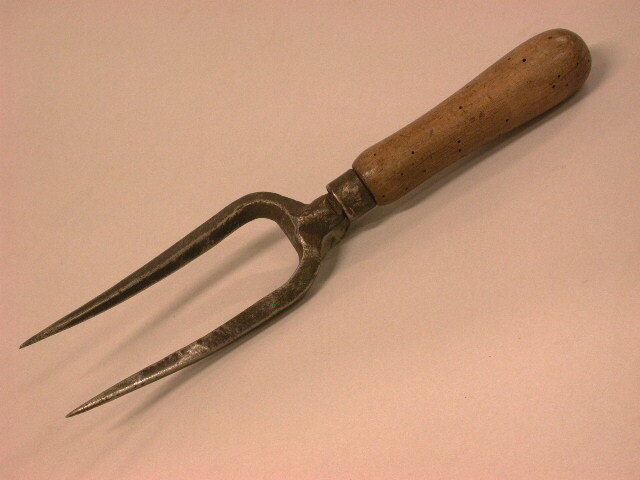 - BeschrijvingStevige tweetandige vork met vierhoekige tanden die in een spitse punt eindigen. D.m.v. angel in een houten handvat gestoken.