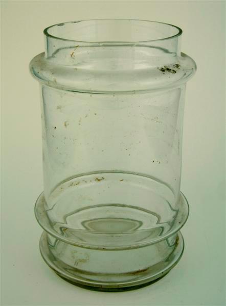 Glazen cylindrische pot met onderaan twee sierranden en bovenaan een rand waarop een deksel kan rusten (ontbreekt).