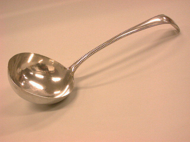 Lepel met diepe, ronde bak en sterk gebogen steel (met punt-rand). Om op te scheppen.