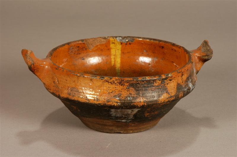 - BeschrijvingRood aardewerk met rood loodglazuur aan rand buitenzijde en aan binnenzijde. Van binnen vier gele strepen van rand naar beneden. Twee steeltjes als handvat.