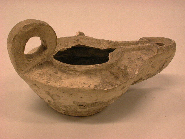 Grote Romeinse olielamp. Firmalamp met kanaal. Slanke vorm. Vervaardigd van witte klei. Ongevernist