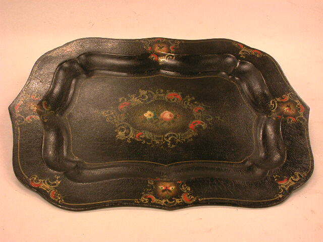 Rechthoekig dienblad met decoratieve rand. Geheel zwart geverfd met bovenop een goudkleurig rand met vlinders en centraal een bloemmotief.