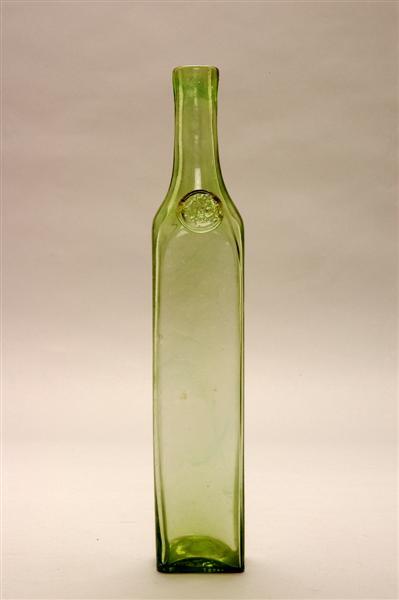 Vierhoekige langwerpige fles van groen glas met opgehoogde zool en stempel aan de voorzijde.