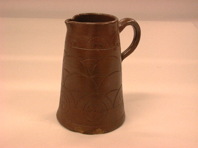 Melkkan met oor en schenksneb, versierd met ingekraste cirkelmotieven en initialen.