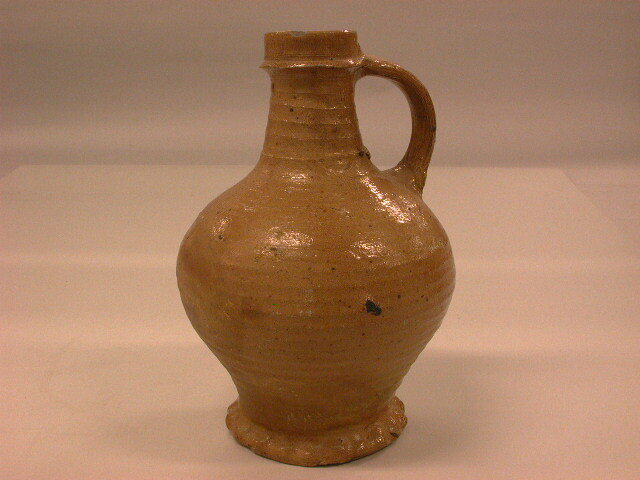 - BeschrijvingKruik, tapse hals en manchetkraag. Buikig met geknepen voet. Olie- of toch schenkkan?