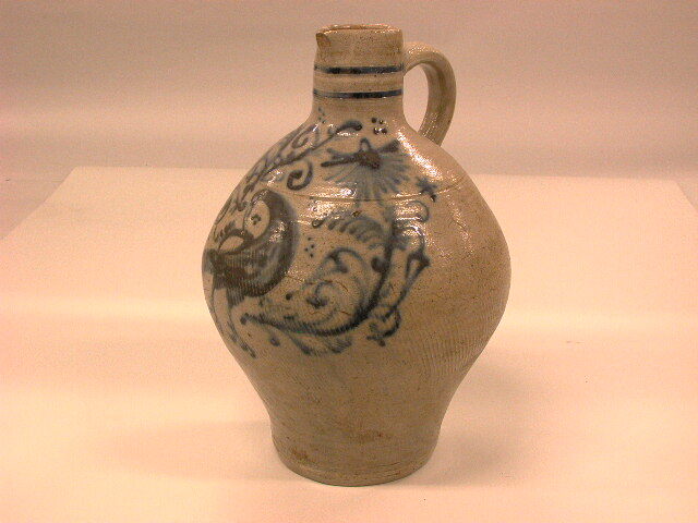 Schenkkan met vrij nauwe hals. Beschilderd in kobaltblauw met een vogel, omringd door florale motieven.