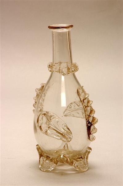 Druppel-vormige karaf met 4 lobbige voet 2 hanekammen en 2 bladeren aan de hals een stulprand platte, brede bovenrand.