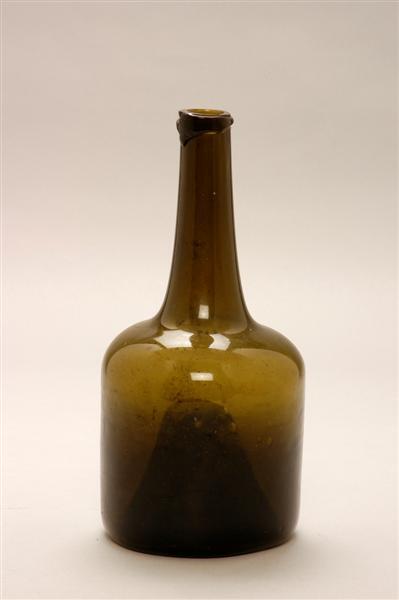 Cylindrische fles met sterk opgehoogde zool, hoekige schouder en smalle hals. Groen glas.