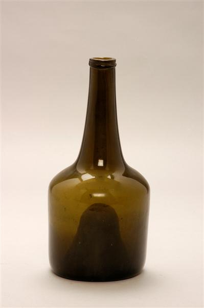Cylindrische fles met sterk opgehoogde zool hoekige schouder en smalle hals. Groen glas.