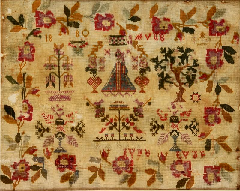 - BeschrijvingMerklap uit 1880 en zwartgelakte houten reliƫflijst. Langs de binnenkant een randje. Glasplaat aan de achterkant bedekt met 3 houten plankjes.