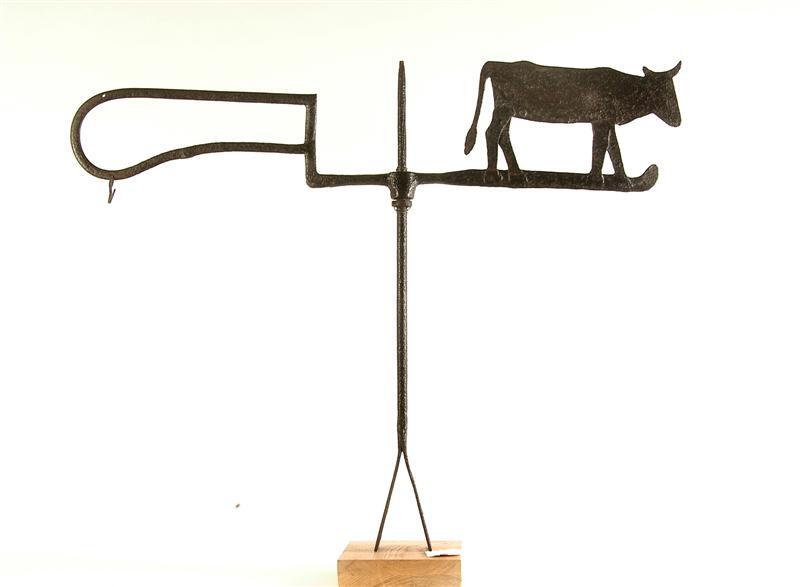 - BeschrijvingStevige steel met 2-delig huis met dubbelzijdige windvaan aan één zijde een koe, aan de andere zijde een beugel met een haakje