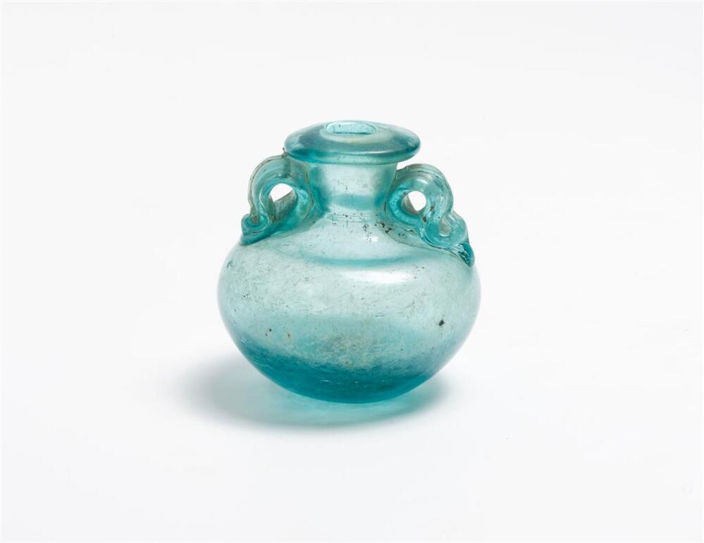 Bol flesje met dolphyne oortjes (ruw). Aryballos. Naar buiten omgeslagen, platte lip.
