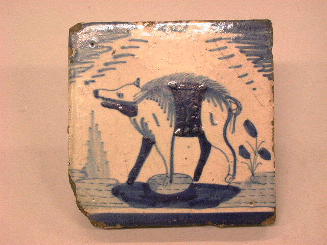 Tegel met daarop de afbeelding van een lopende ever in een landschap.