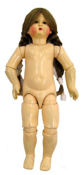 Pop van papier-maché. Hoofd beschilderd, glazen ogen, gesloten mond. Blonde pruik met vlechten van echt haar. Geladen armen en benen met houten kogelgewichten in schouders, ellebogen, heupen en knieën. Wit katoenen hemd (met de hand genaaid). Wit katoenen trictot onderbroekje met ingenaaid nr. 55. Witte katoenen onderrok met kantje en opgezette strook met kantje. Met de hand genaaid, wit katoenen jurkje, bedrukt met blauwe bloemetjes. Strook langs hals en mouwtjes afgezet met kantjes. Onder aan de rok machinaal aangezette strook. Split middenachter met 2 glazen knoopjes en 2 knoopsgaatjes. Bruine leren bandschoentjes met spitse neuzen. Sluiting met bruine knoopjes en strikjes. Fluwelen strikje op voorvoet. Witte nylon sokjes met elastiek. Koperen scapuliertje aan gouddraadje om hals. Haarband van zijden roosjes en blaadjes.