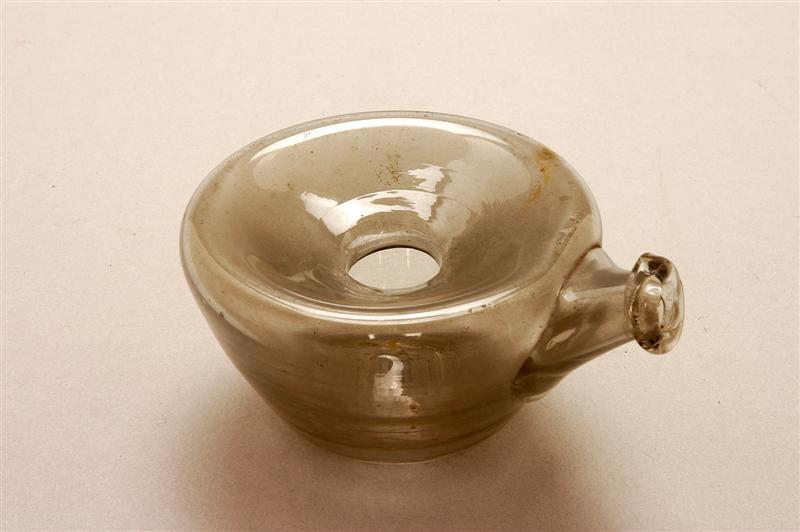 - BeschrijvingTaps naar beneden toe lopend reservoir met platte bodem en bovenin een gat met zijwaarts een kleine tuit met dikke rand.