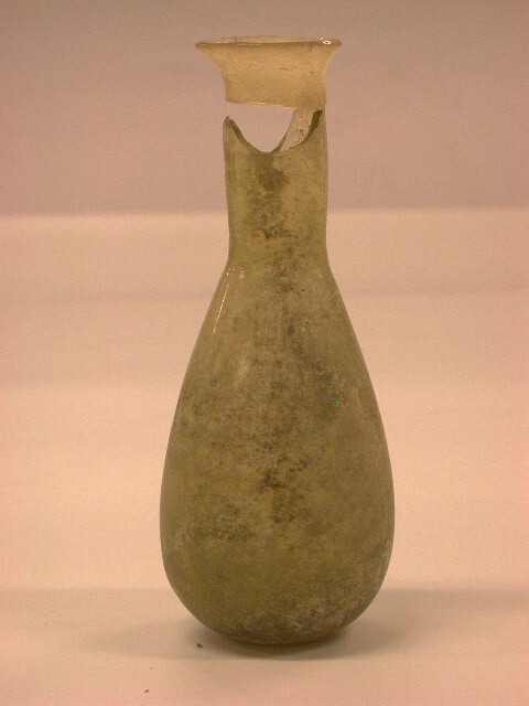 Langwerpig balsamarium unguentarium van blauwgroen glas. Zgn Schlauchvorm.