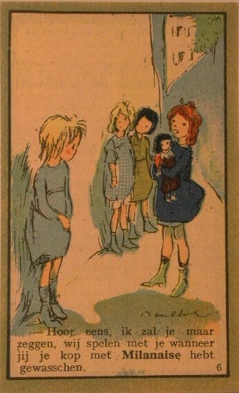 - BeschrijvingTwaalf verschillende afbeeldingen van spelende en plagende kinderen met onderschrift en wervende tekst op keerzijde.